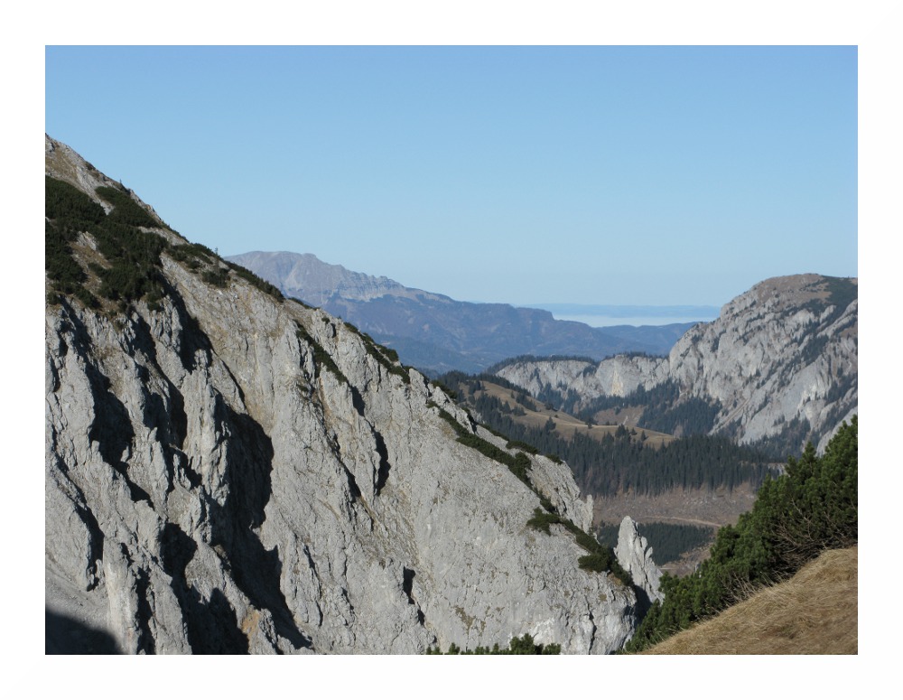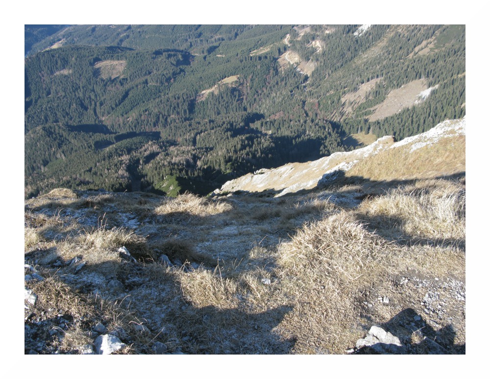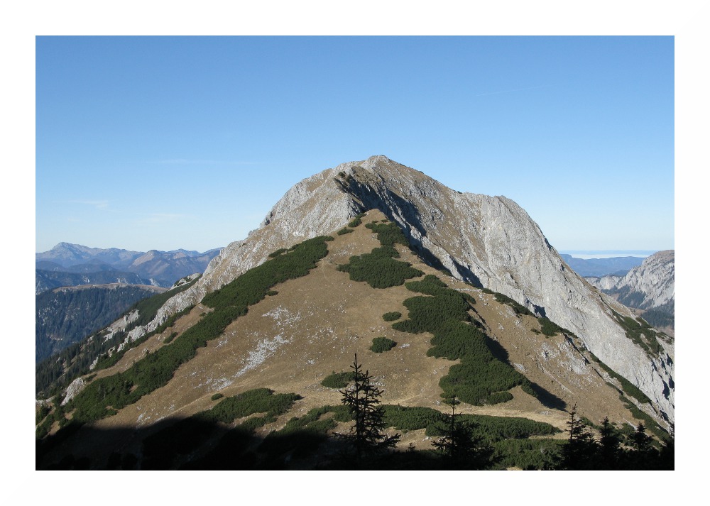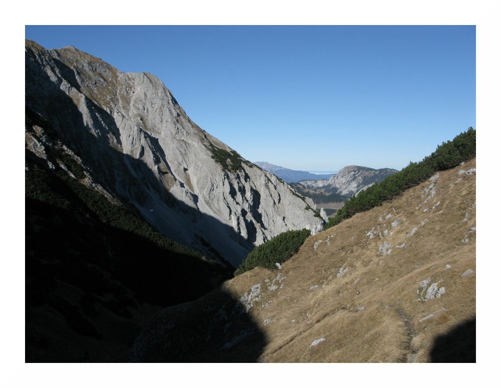 Das überraschend geräumige Gipfelplateau bietet einen Blick bis zum Dachsteinmassiv, das beim Abstieg zum Kleinen Wildkamm auch den Blick auf den Hohen Dachstein freigibt. Der Weg führt nun meist rechtsseitig des Kamms durch steilen Latschenbewuchs. Wegen der erwähnten Reifablagerung sollte der Blick nicht auf die grandiose Umgebung abschweifen, da stellenweise glatte Abschnitte dabei sind. Der Kleine Wildkamm ist schließlich harmlos, und ohne Gipfelkreuz (nur Gipfelbuch), in weiterer Folge geht es steil zur Sohlenalm hinab, wobei der Steig beim Übergang Latschen - Nadelwald endet. Letzterer ist allerdings sehr licht, hier und da sind auch Wegmarkierungen bzw. Steigspuren sichtbar. Tendenziell hält man sich eher rechts, dann kommt auch bald die Sohlenalm in Sicht.