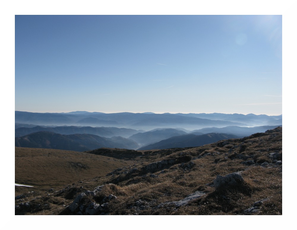 Im Vordergrund erstreckt sich das Mürztal mit dem Dunst, darunter verbirgt sich schattenseitig eine wunderschöne Reiflandschaft.