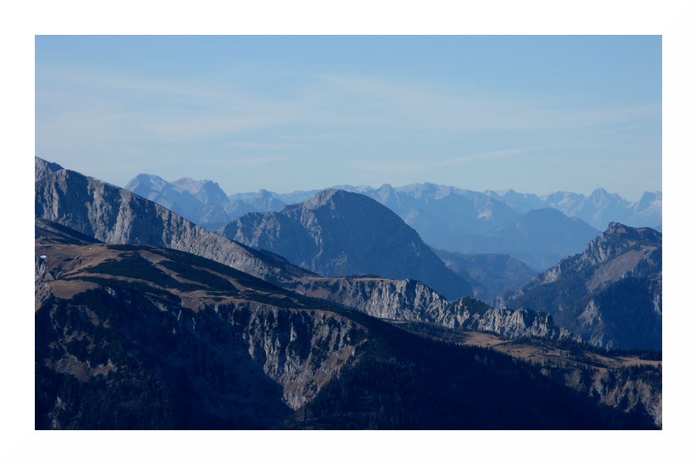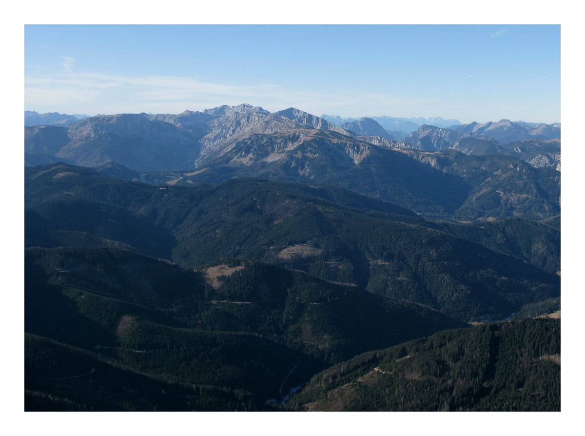 Hier reicht der Blick vom Großen Buchstein über den Großen Priel bis zum Dürrenstein. Eine Reihe davor sind links Riegerin, Hochtürnach, Hochstadl und Fadenkamp zu sehen.