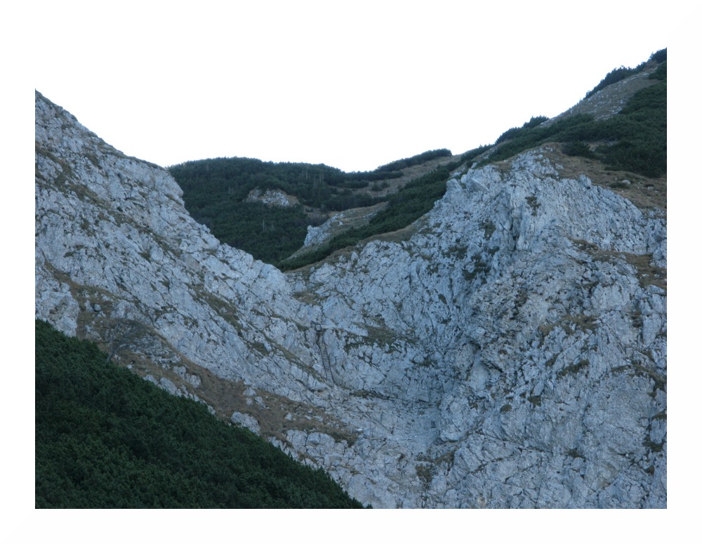 Hier führte der Steig früher anscheinend durch die Einsattelung mit der Eisenleiter, inzwischen umgeht er diesen aber rechts und kommt oben bei den Latschen heraus. Der Wind nimmt durch die Kanalisierung stark zu. Im Winter wird der Schnee teils beträchtlich ins Lee verfrachtet und füllt die Rinne großteils aus.