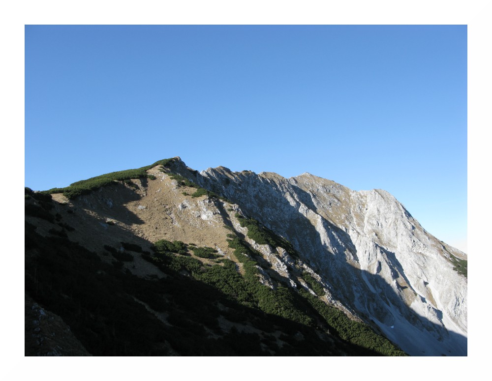 Bild 6: Großer Wildkamm (1854m). Bis zum ersten Zacken am Grat mit den Latschen ist der Weg unschwierig, dahinter beginnen die ausgesetzten Felsaufschwünge, die sich bis zum Gipfel ziehen.