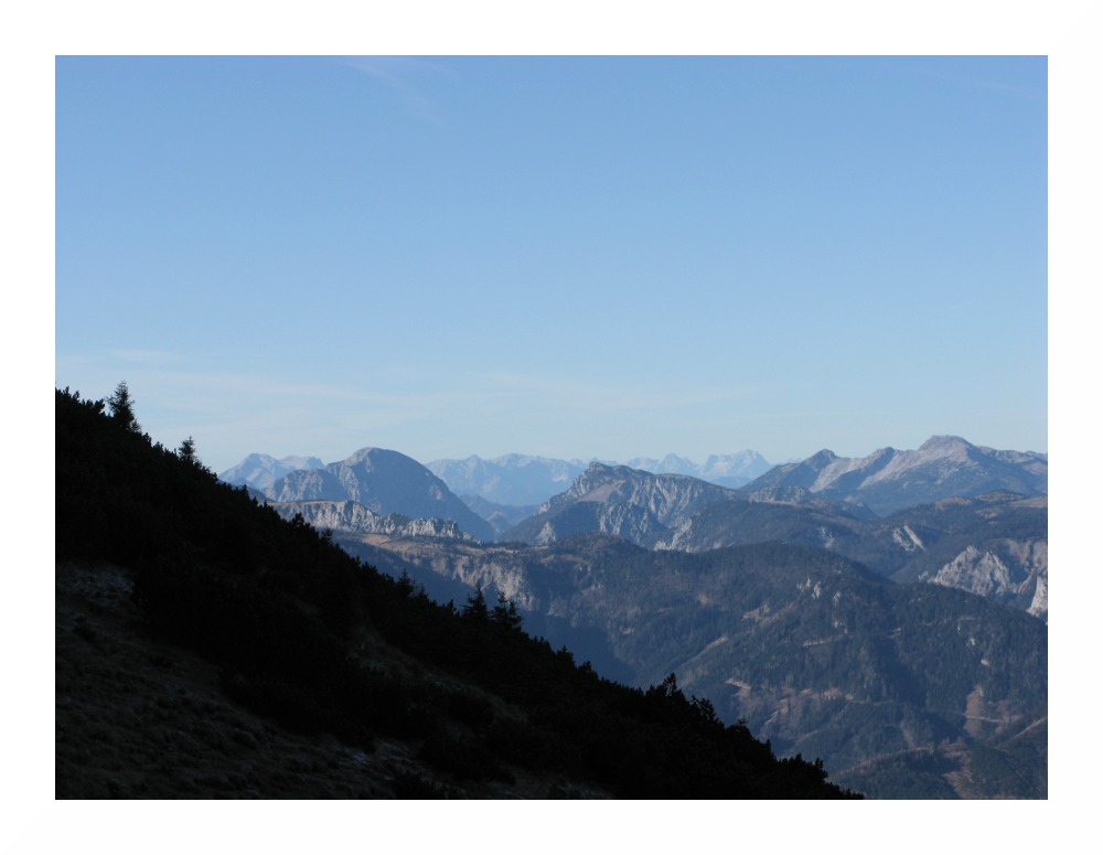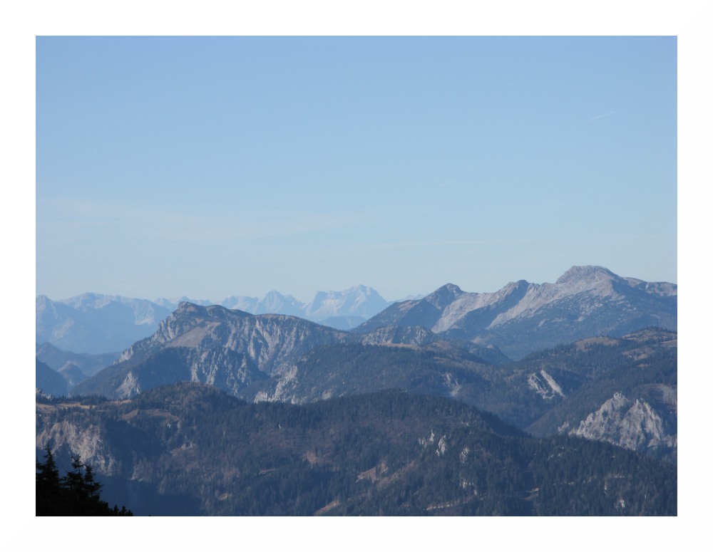 Bild 5: Zoom auf den Rauhen Kamm und Tonion. Die flach gerundete Erhebung am Horizont rechts des Rauhen Kamms könnte schon 100-110 km entfernt sind. Vermutlich handelt es sich um Erhebungen zwischen Mühlviertel, Waldviertel und Tschechien. Denn das, was links vom Tonion durch einen flachen Buckel klar von dem dahinter abgegrenzt ist, dürfte bereits rund 70-80 km entfernt liegen.