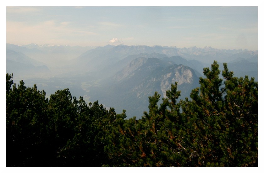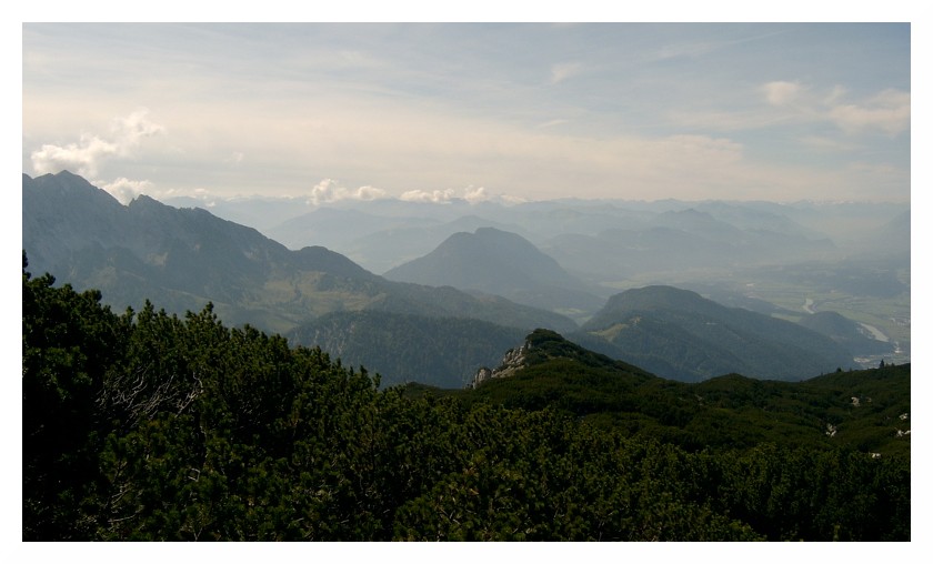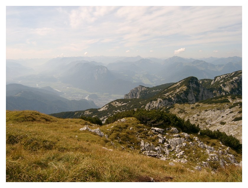Bild 20 Blick nach Südosten über die steilen Felswände des Winkelkars hinweg, links Loferer Steinberge, rechts evtl. Lärchegg oder Ackerlspitze (Wilder Kaiser), die Sicht verliert sich im Pinzgau bzw. Pongau, und im kompakten Cirrostratus, der den Himmel milchig erscheinen lässt.
