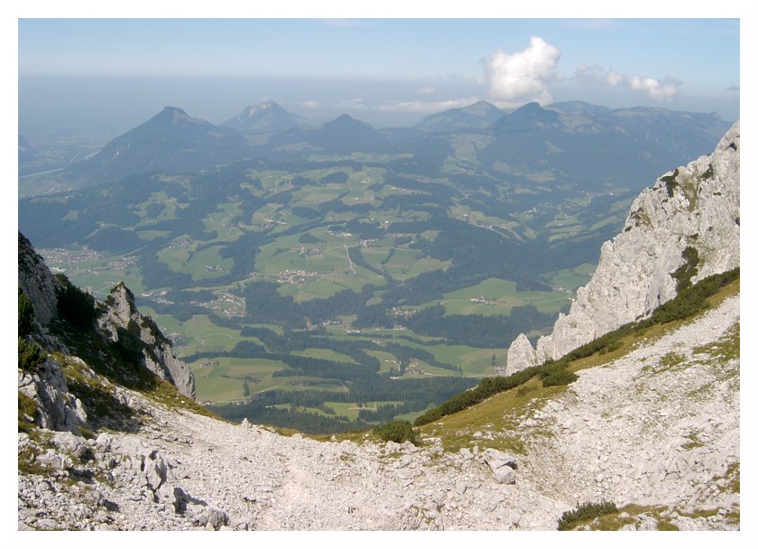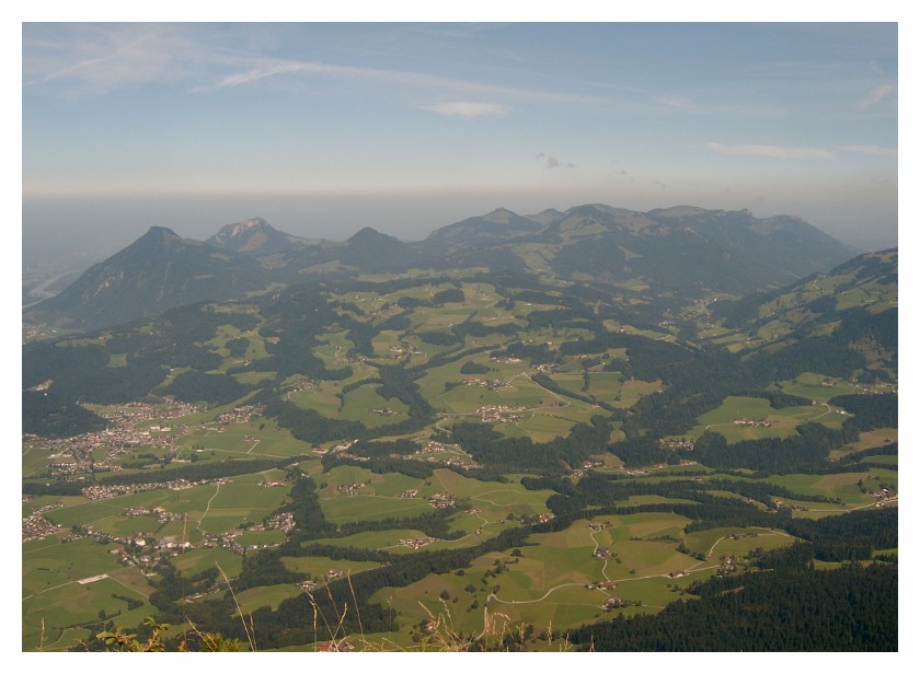 Bild 8 Knapp unterhalb des Peterköpfl (1745m), das ich rechts liegen ließ, kann man ungehindert nach Norden schauen. Hinter dem Gras geht es rund 1000 hm nahezu senkrecht in die Tiefe. Links die größere Häuseransammlung ist Niederndorf (500m), dann sind diverse kleinere Siedlungen zu sehen, ganz links Kranzhorn (1368m) und Kitzstein (1398m) am Inntalausgang. Dort bläst der Taleinwind immer besonders kräftig (Düseneffekt). Das Alpenvorland liegt wie so oft unter einer schmutzigen Dunstglocke.