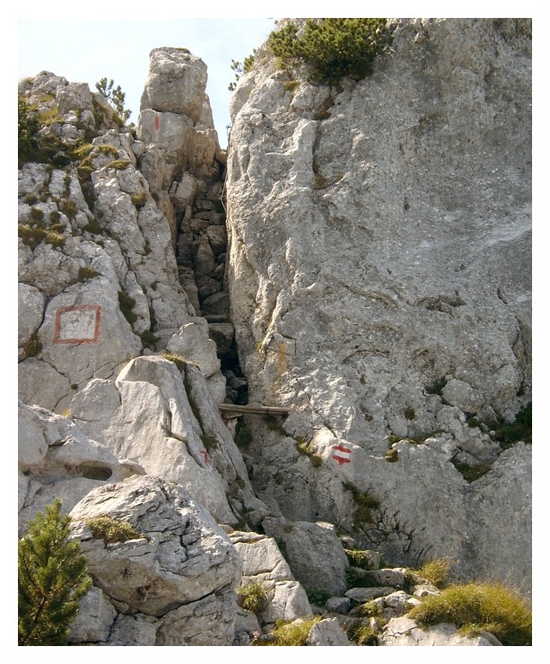 Bild 15 Die einzige Stelle beim Aufstieg, wo man die Hände einsetzen muss, beim "Vogelbad". Mit Seil gesicherter Kamin völlig problemlos machbar. Nördlich vom Vogelbad setzt das Egersgrinn an, südlich davon der Alternativauf/abstieg von Hinterkaiserfeldenalm (1480m) und Vordere Steingrube kommend.