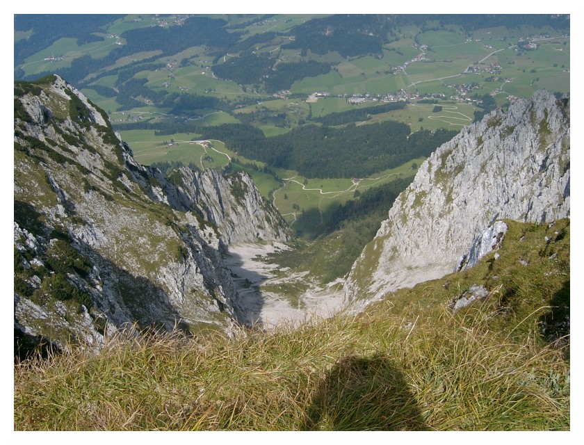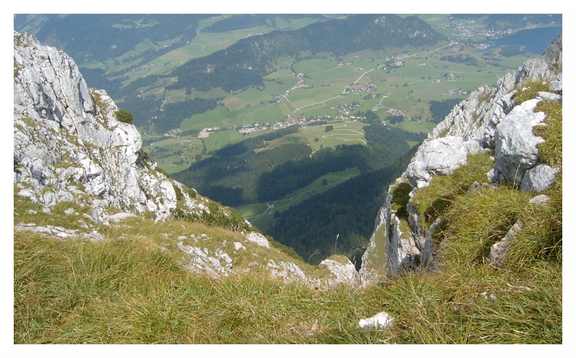 Bild 16 Kurz vor dem Gipfel der nächste Tiefblick, unten der Ort Durchholzen (691m) inmitten von Wiesen. Ausgangsort für die Besteigung übers Winkelkar über Großpoitneralm (928m) bzw. Jovenalm. Ganz rechts hinten der Walchsee (655m).