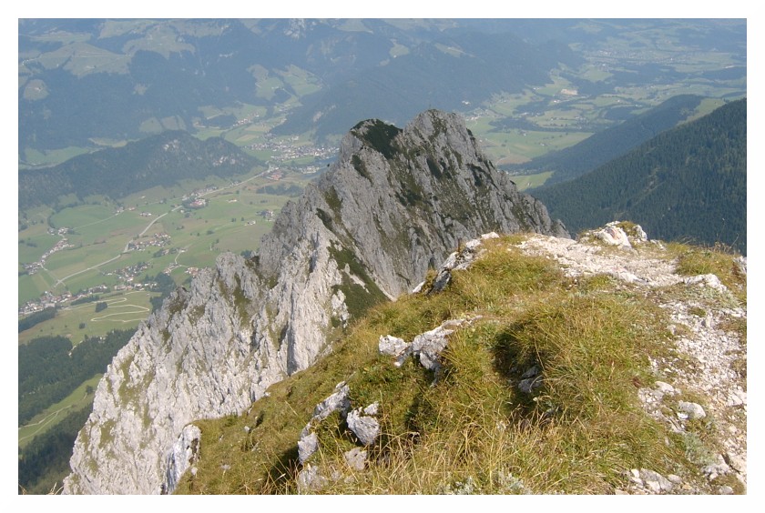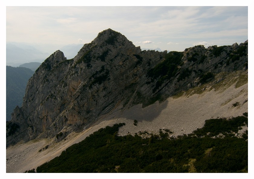 Bild 21 Die Vordere Kesselschneid, unten rechts verläuft der Weg ins Öchselweidkar, meine Abstiegsroute, im Hintergrund Wilder Kaiser, hinterm Kaiser waren auch die Hohen Tauern zu sehen, jedoch im Dunst/Wolken nur unscharf erkennbar.