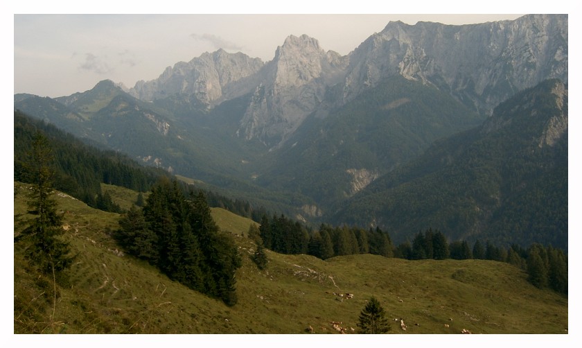 Bild 27 Unterhalb der Ritzaualm, links Stripsenkopf (1807m) mit Stripsenjoch (1577m), beliebte Überschreitung vom Kaisertal ins Kaiserbachtal. Mittlerweile verschwand die Sonne hinter den dichten Schleierwolken, ein fröstelnder Taleinwind wehte das Kaisertal hinauf.