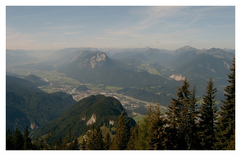 Bild 9 Das ist also das Tor nach Bayern, rechts nochmals Kranzhorn und Kitzstein, links des Inns Wildbarren (1448m) und Großer Riesenkopf (1337m), ganz links Wendelstein (1838m), einer der windigsten Orte des deutschen Alpennordrands, bei Orkan "Lothar" (26.12.1999) und Orkan "Kyrill" (18.01.2007) wurden hier über 200 km/h gemessen. Unten der Ort Ebbs (475m).