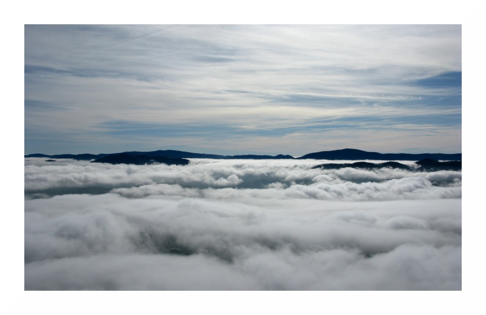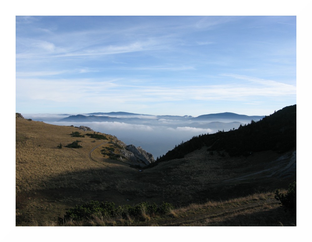 Im Hintergrund links Sonnwendstein, rechts Stuhleck, dazwischen Semmering. Im Vordergrund überströmte der Hochnebel die Einsattelung zwischen Traten- und Pinkenkogel. In der Mite des Preinertals (rechts geht es zum Preiner Gscheid weiter) löste sich der Hochnebel wie an einem Reißverschluss auf. Grund: absinkende Luftbewegung durch die Querzirkulation der Hangwinde.