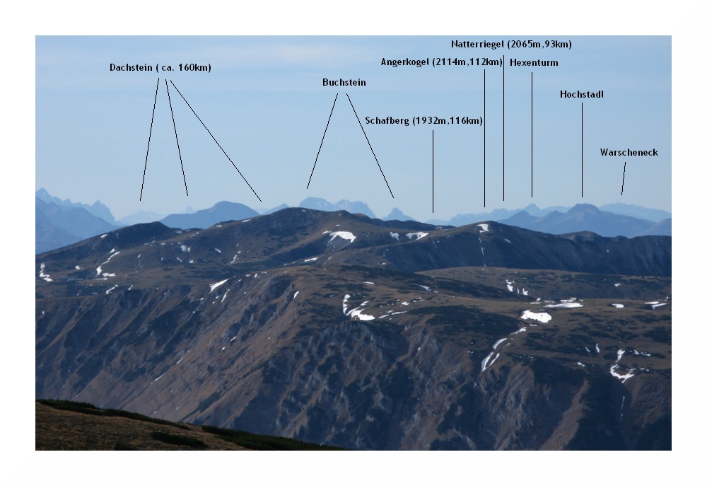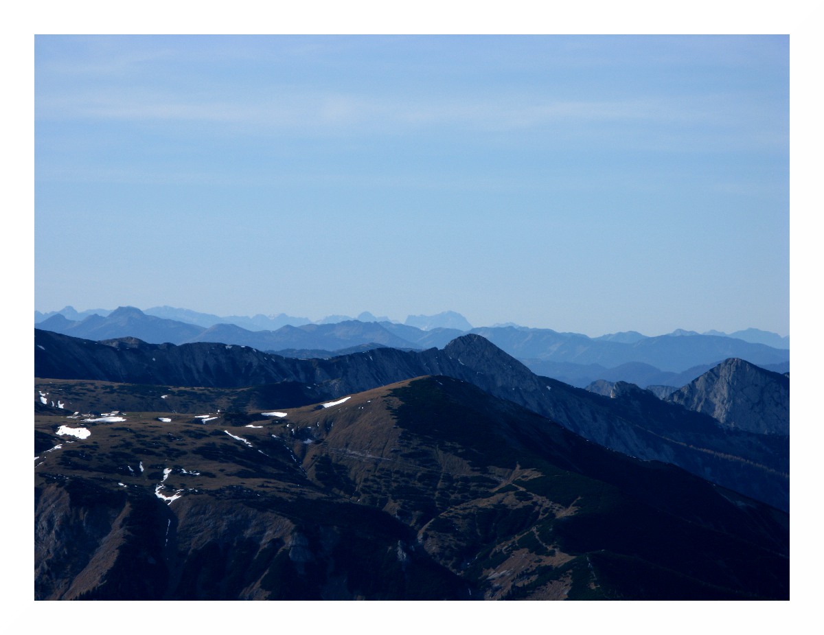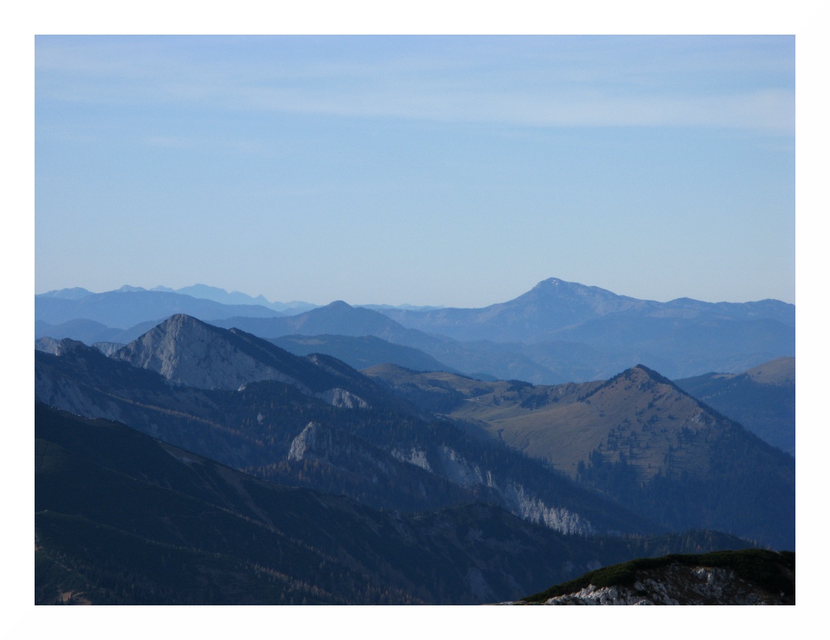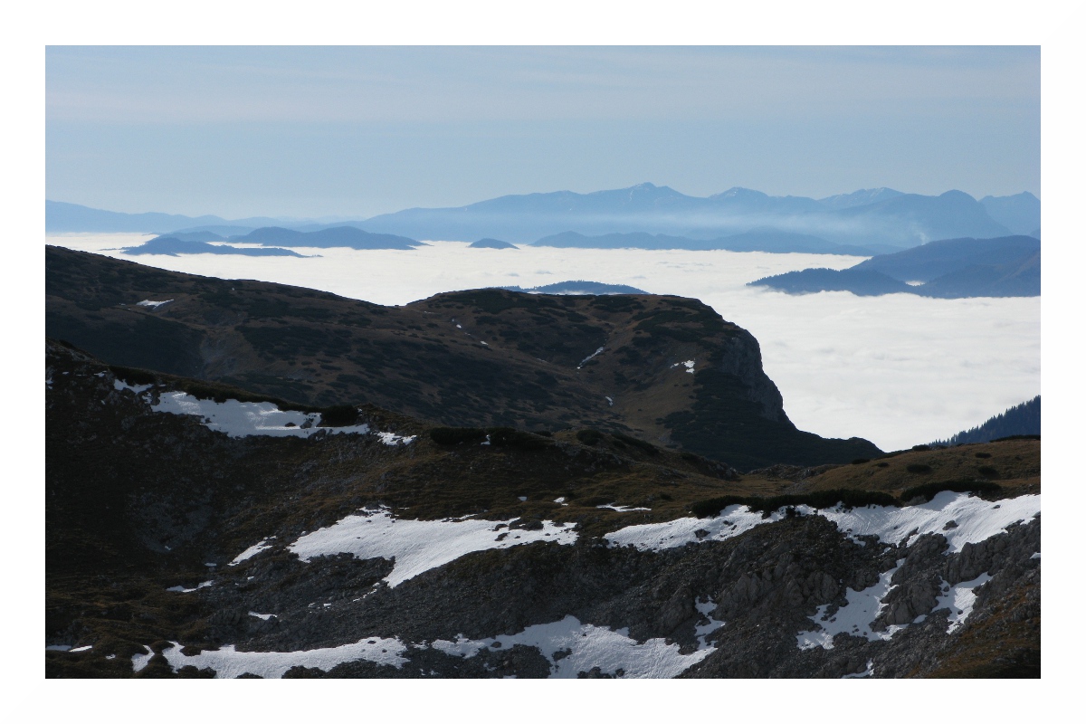 Links Reisalpe und Hochstaff, eine Reihe davor Obersberg, ganz vorne links Handlesberg, rechts Kuhschneeberg. Links der Bildmitte am Horizont müsste der Jauerling zu sehen sein, ich sah da auch etwas turmartiges in der Mitte eines Höhenzugs, leider zu weit weg zum fotografieren. Sehr schön sieht hier, wie der Hochnebel in den Voralpen Halt macht und in feuchten, später trockenen Dunst übergeht.