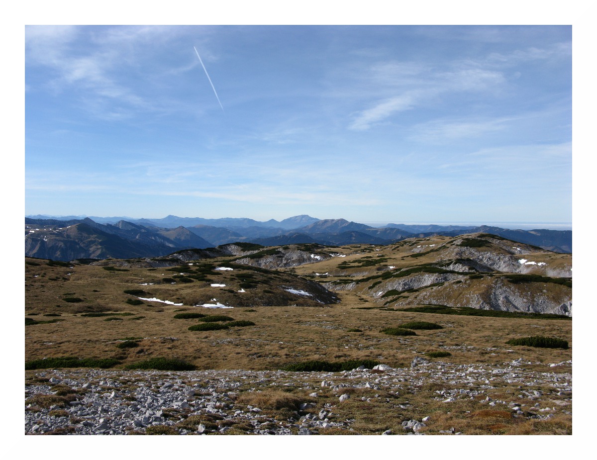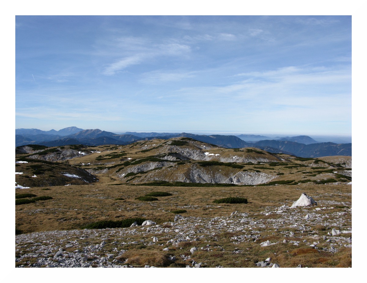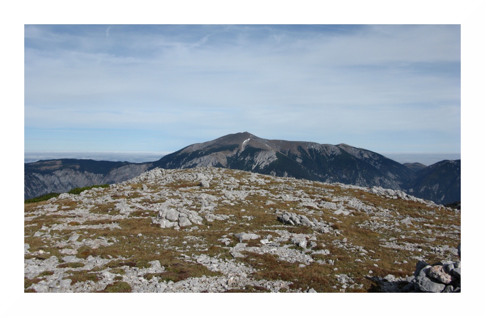 Im Vordergrund das unübersichtliche Raxplateau, auf dem man sich bei Nebel besser nicht aufhalten sollte.