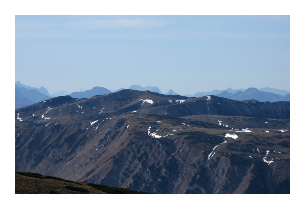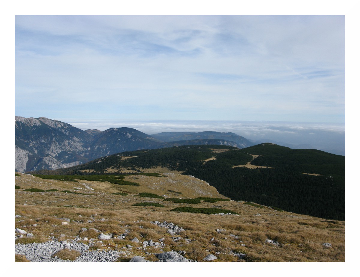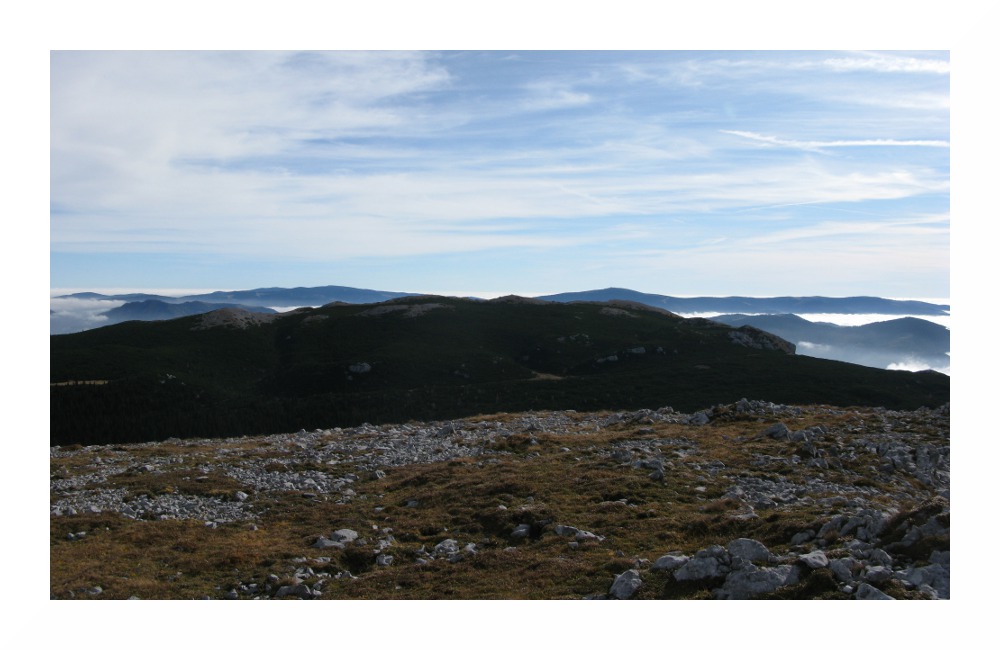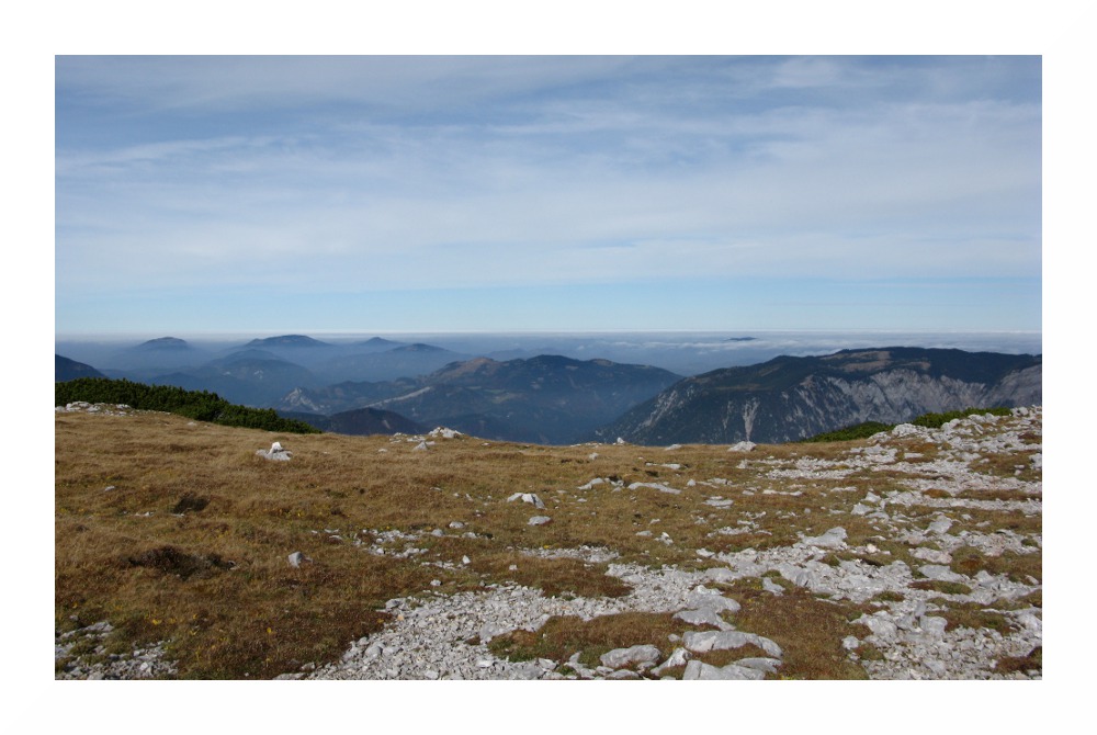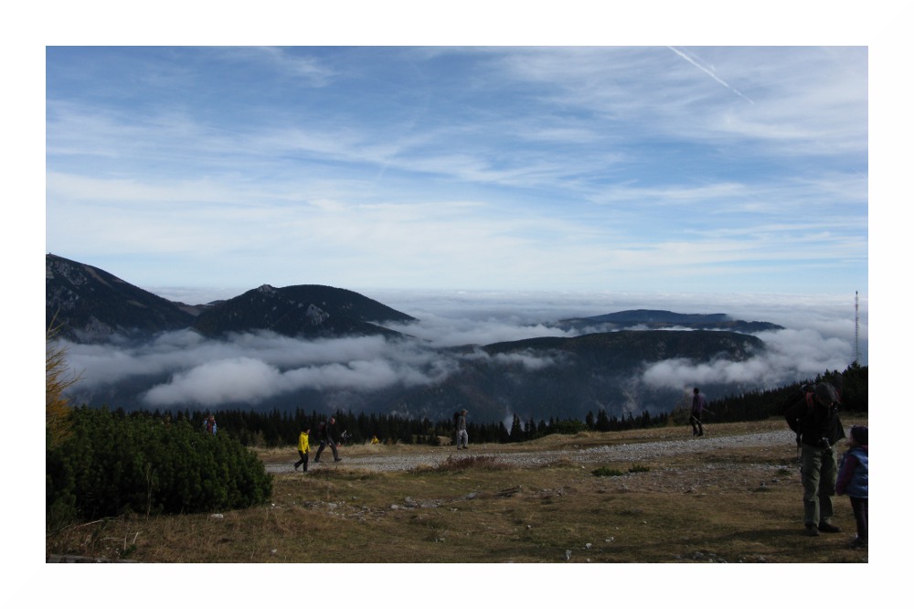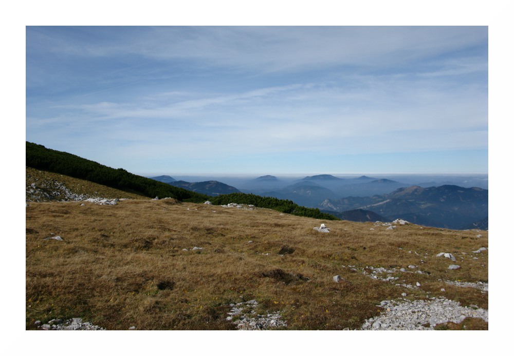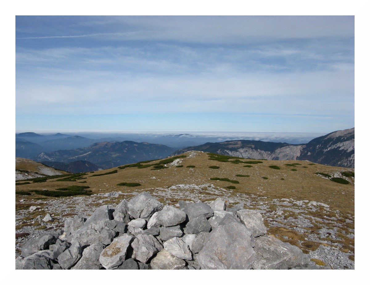 Nichtsdestotrotz hat mich diese 'Speedtour' an meine Grenzen gebracht: am Vorabend zu wenig Kohlenhydrate gegessen, wie üblich wenig gefrühstückt und unterwegs nur Bananen und Müsliriegel, da ich selbst am Gipfel nichts runterbrachte. Durch das starke Schwitzen in der milden Herbstsonne auf dem Plateau verlor ich Elektrolyte, ich hatte mich zudem viel zu warm eingepackt - und hätte da an Gewicht sparen können. Unter solchem Zeitdruck bin ich das erste Mal gegangen, aber die Schinderei wurde durch die grandiose Gipfelsicht belohnt. Das soll jetzt kein Anreiz sein, es gleich zu tun, ich wäre lieber 2 Stunden früher gestartet, aber die südlichen Gipfel der Rax bieten nunmal keine Aussicht nach Westen - Heukuppe, Predigtstuhl und Dreimarkstein verhindern dies. Da ich von dem Rundumblick von der Scheibwaldhöhe wusste, und die Wetterlage perfekt war (sehr niedrige Luftfeuchte oberhalb des Hochnebels, entsprechend weite Sicht), hab ich die Strapazen auf mich genommen.