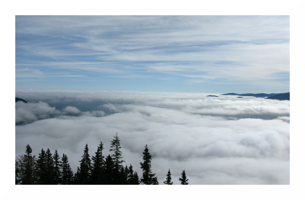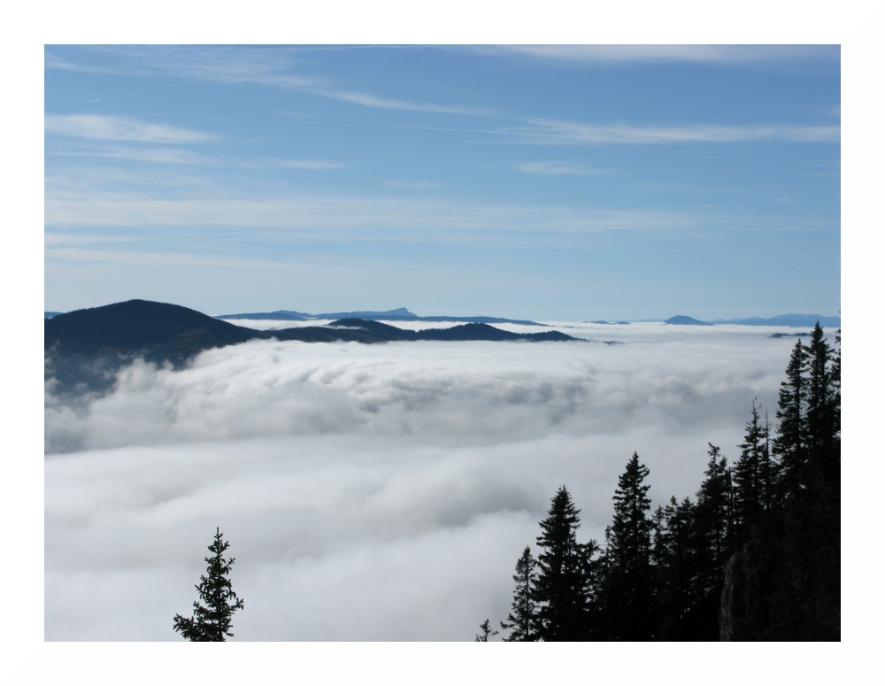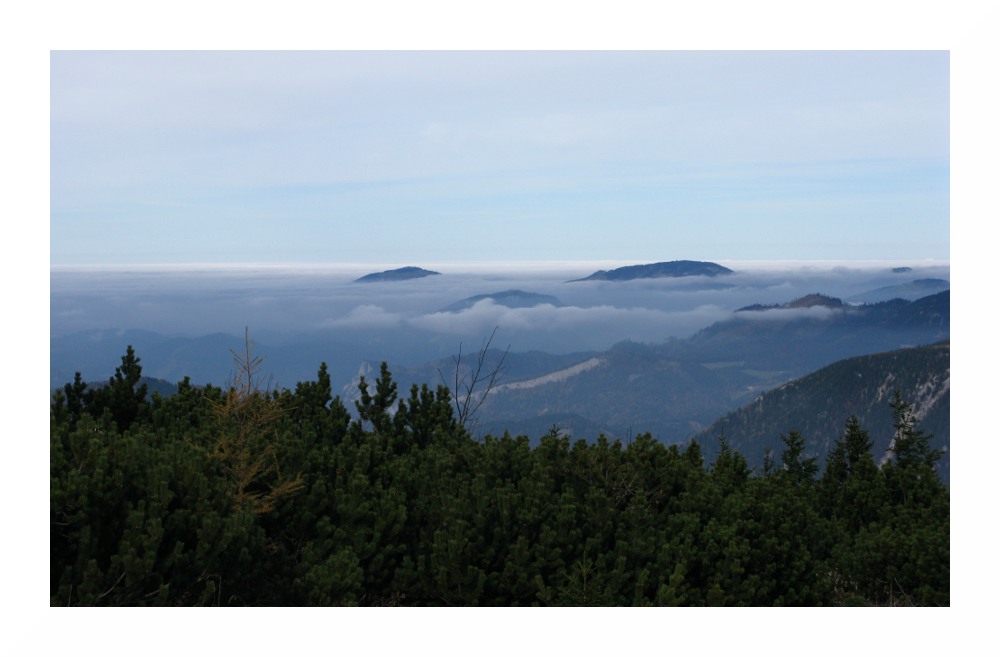 im Vordergrund Preiner Gscheid mit wasserfallartigem Hochnebel. An den Pässen unterhalb des Hochnebels wehte den ganzen Tag Südwestwind, obwohl die Luftströmung sonst gering war. Ursache: Die Inversion war auf steirischer Seite geringfügig höher als auf niederösterreichischer Seite. Um 14.00 MESZ lag die Inversion im Grazer Becken um 1380 m, im Wiener Becken auf 1350 m. Das Absinken der Hochnebelgrenze bewirkte Föhn an den Pässen.