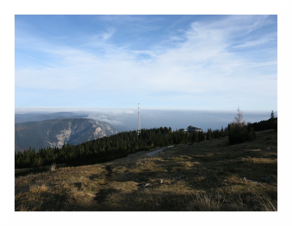 Rax-Seilbahn-Bergstation mit Sendemast, links davon Mittagstein. Viele Schleierwolken in der Höhe deuten weitere Warmluftzufuhr an, und in diesem Fall keine (!) Wetterverschlechterung in den kommenden 2-3 Tagen.