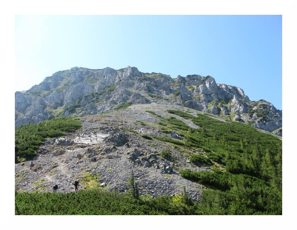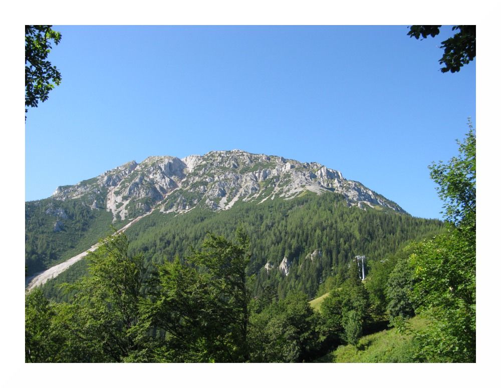 Bild 1: Zwischen Sessellift-Talstation und Edelweißhütte mit Blick zur Nordostflanke des Schneebergs, links durchzieht eine Schotterrinne, die Lahningries, den Berg, links befindet sich der Nandlgrat, weiter rechts sieht man den Fadensteig, wo nochmals ein breiteres Schotterfeld sichtbar wird. Zu diesem Zeitpunkt war der Himmel komplett wolkenlos.