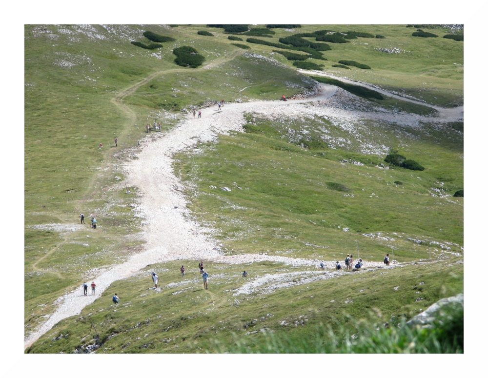 Bild 24: Völkerwanderung von Tagestouristen, oft mit unpassendem Schuhwerk (Sandalen), von der Schneebergbahn zur Fischerhütte. Der Weg an sich ist harmlos, ein breiter Fahrweg, aber durchwegs mit grobem Schotter durchsetzt, der das Schuhwerk und die Füße in Mitleidenschaft ziehen kann. Ungünstig ist dies dann bei Nässe (etwa das später aufziehende Gewitter), vom schlechten Halt ganz abgesehen.