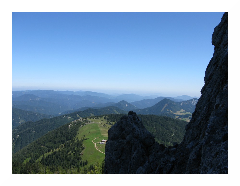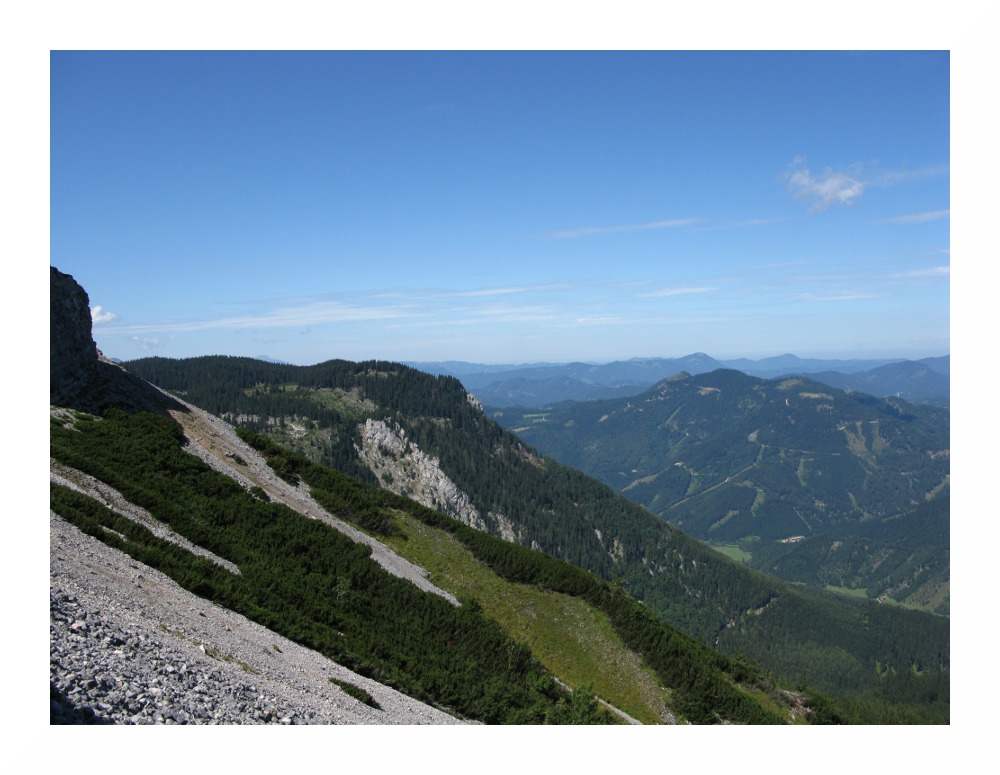 Bild 3: Nach der ersten Kletterpassage ein Blick zurück zur Almreserlhütte (1222m) auf der Putzwiese, der Mugel dahinter ist die "Dürre Leiten", weiter nordostwärts (rechts) der bewaldete spitze Gipfel des Schober (1213m) und der felsigere Öhler (1183m), im Hintergrund ein Großteil der Gutensteiner Alpen - die Dunstschicht am Horizont markiert das Donautal bzw. Wiener Becken