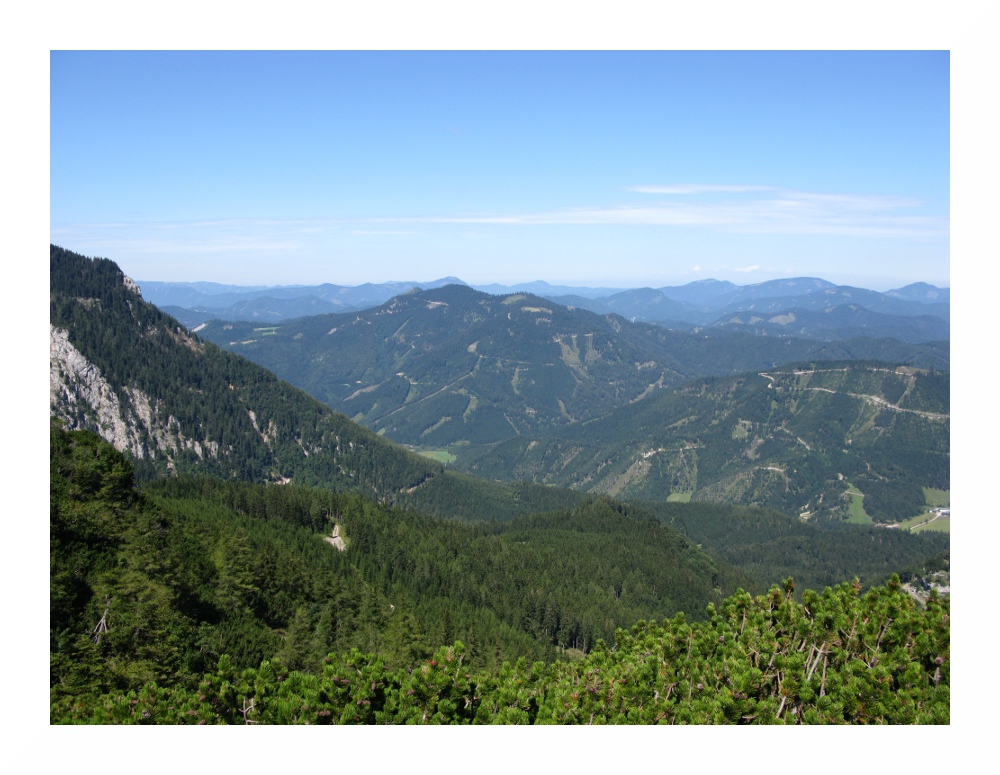 Bild 7: Im Nordnordosten schaut glasklar der Residenzberg (818m) bei Gutenstein mit der barocken Wallfahrtskirche Mariahilfberg hervor. Ganz rechts lugen die Hirschwände des Hausstein (664m) heraus. Sie flankieren die Talenge oberhalb der Myrafälle nordwestlich von Pernitz. Auf dem breiten Sattel darüber steht der Gasthof Jagasitz, nördlich dahinter (für mich unsichtbar) die sehenswerte Steinwandklamm