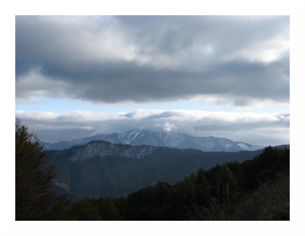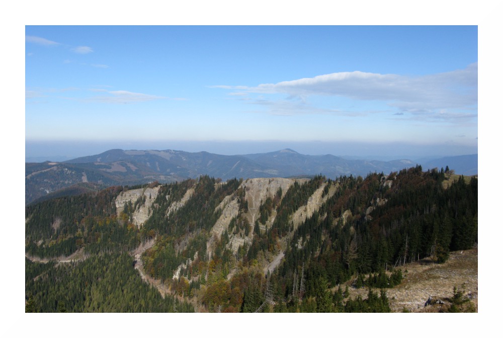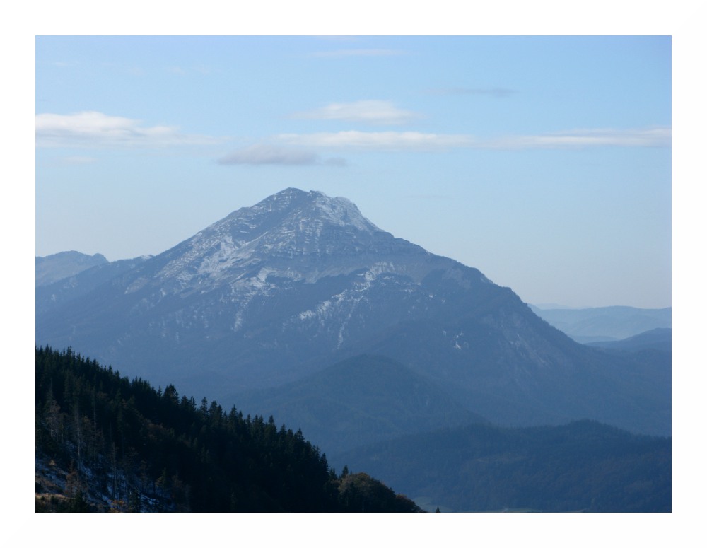 Im Osten ragt links der Bildmitte der Türnitzer Höger (1372m) auf, der nach Süden zu in einen langen Kamm übergeht, mit Paulmauer (1248m) und Bürgeralpe. Links vom Türnitzer Höger befindet sich die Hinteralm (1311m) und knapp links davon mit Muckenkogel (1248m) mit Sendemast. Die Reisalpe, auf der ich am 30.10.10 stand, ist durch den Türnitzer Höger verdeckt.