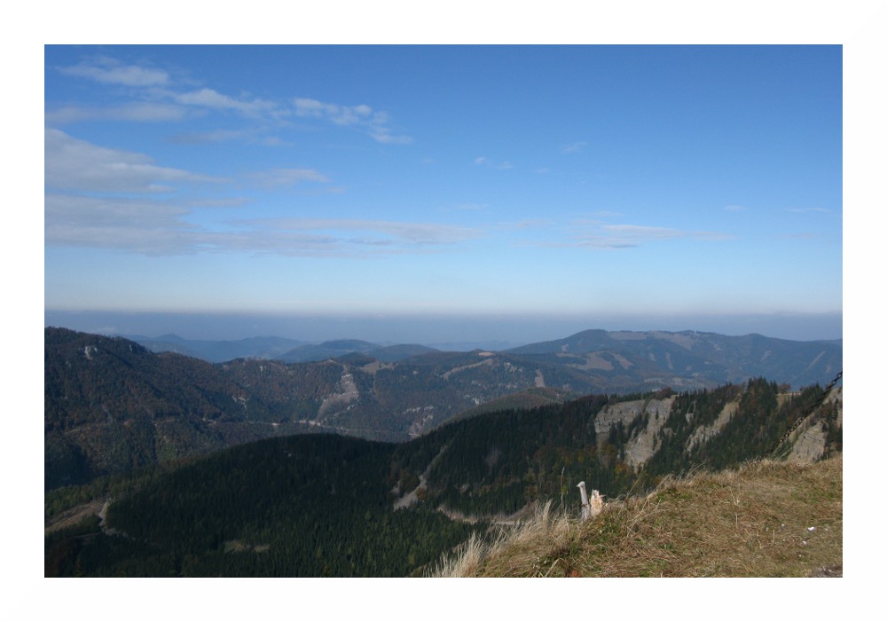 Eine Ebene weiter hinten verdeckt der Hochnebel weite Teile der Voralpen bzw. des Mostviertels, rechts vom Ötscher reicht der Blick aber noch weit nach Nordwesten, vermutlich in die oberösterreichischen Voralpen (ca. 70-100 km).