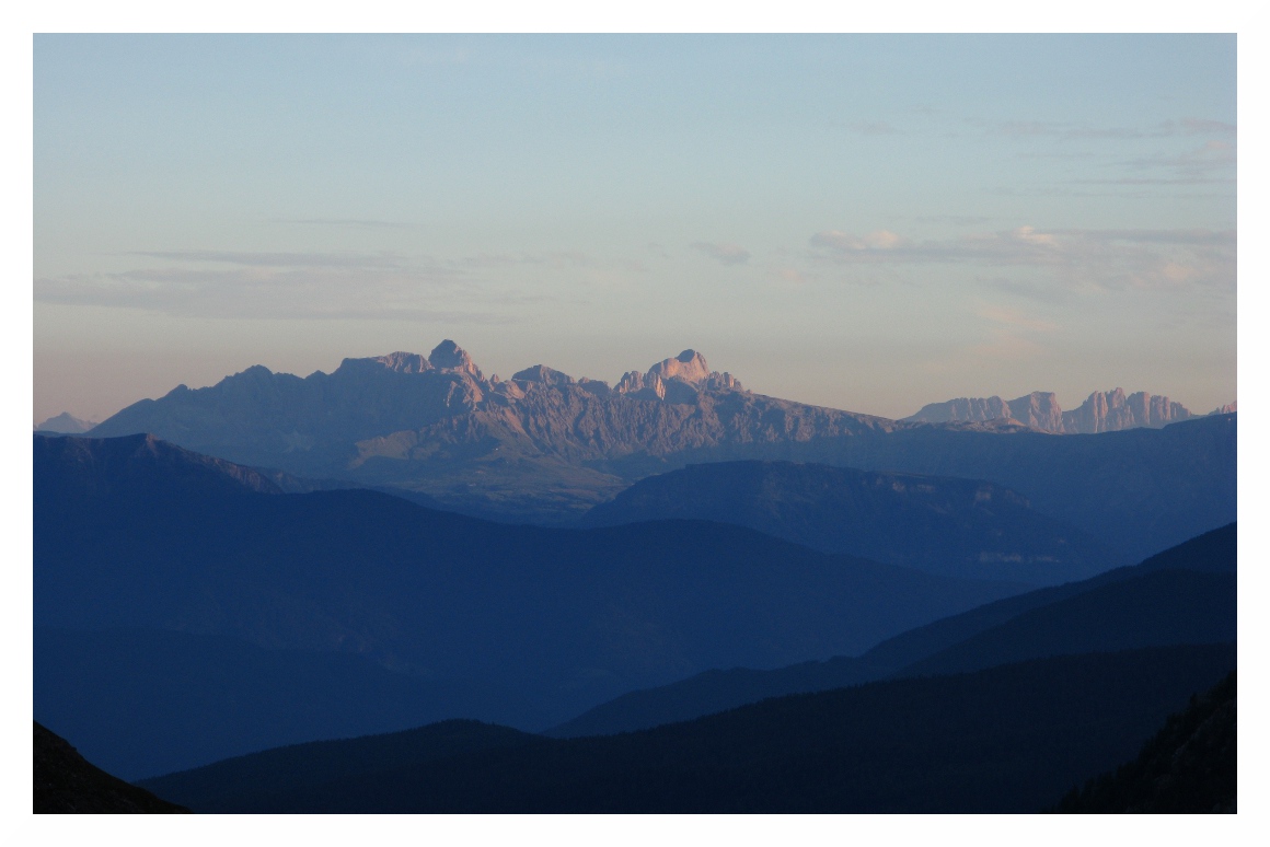 Bild 20: Sonnenaufgang auf der Brixner Hütte, Blick zum Rosengarten, rechts ein Altschneefeld