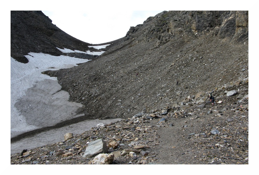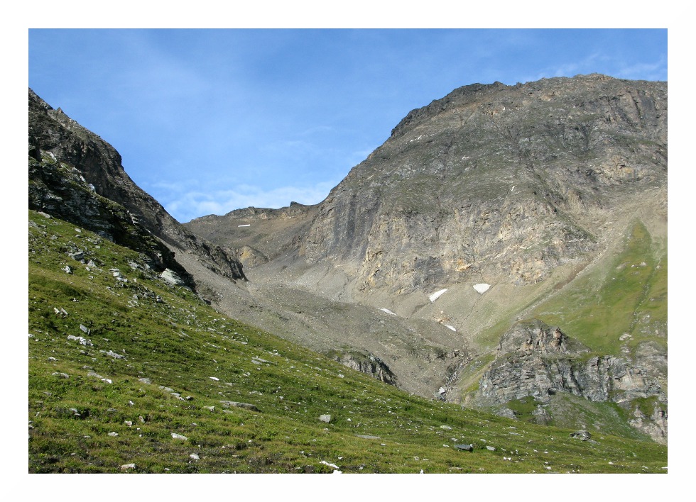 Bild 26: Der weitere Aufstiegsweg geht rechts am Felsen vorbei und folgt dann dem Bett des ehemaligen Rauhtalferners, von dem von ein paar kümmerlichen Altschneefeldern abgesehen nichts mehr übrig ist, rechts erhebt sich die namenlose Spitze.