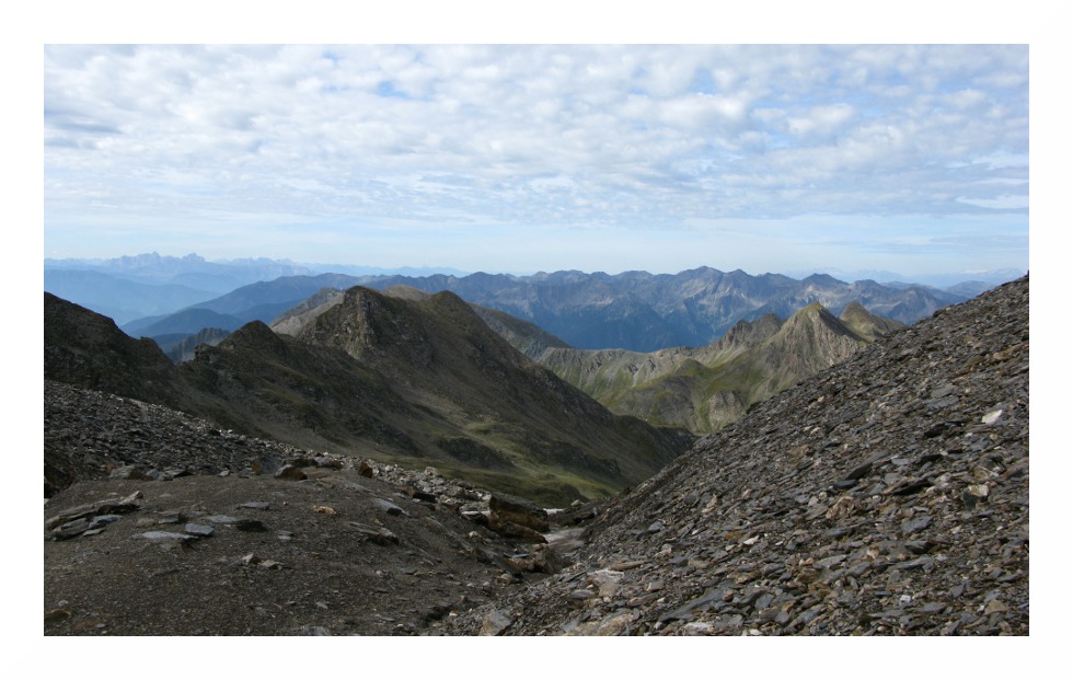 Bild 31: Am Rauhjoch (2807m) angekommen, noch sind knapp 330 hm zu bewältigen. Links die Ehrenpolspitze (2774m), dahinter die Sarntaler Alpen, links Dolomiten, ganz hinten irgendwas Richtung Gardasee, ganz rechts Ortler-Gruppe in 90 km Entfernung. Am Himmel Altocumulus stratiformis opacus. Im Gegensatz zu den Wolken in der Früh schon recht tief, d.h. Feuchte war über weite Strecken der Atmosphäre vorhanden. Noch sind sie aber stratiform, und vertikal nicht groß ausdehnt. Ein bisschen Zeit blieb also noch.